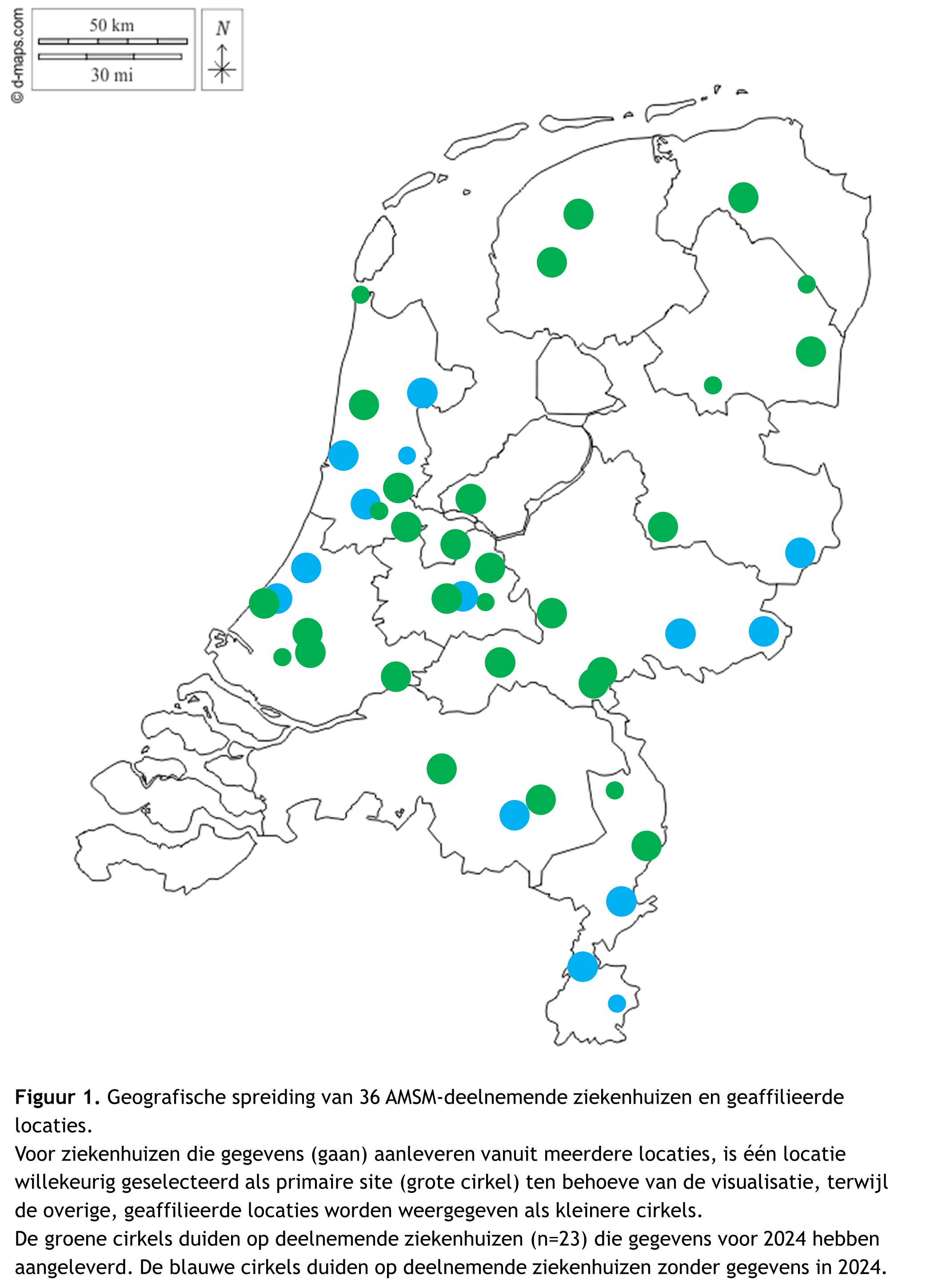 De monitor bevindt zich momenteel in een fase van landelijke opschaling. Nederland telt circa 69 acute zorgziekenhuizen (ongeveer 113 locaties), waarvan een groeiend aantal aan de AMSM deelneemt. Op dit moment zijn 36 ziekenhuizen aangesloten in 2025 (20% toename t.o.v. 2024), waarvan 64% gegevens over 2024 heeft aangeleverd. Het aantal deelnemende ziekenhuizen steeg van 14 in 2021 naar 21 in 2022 (een toename van 50%), 23 in 2023 (+10%) en 30 in 2024 (+30%).