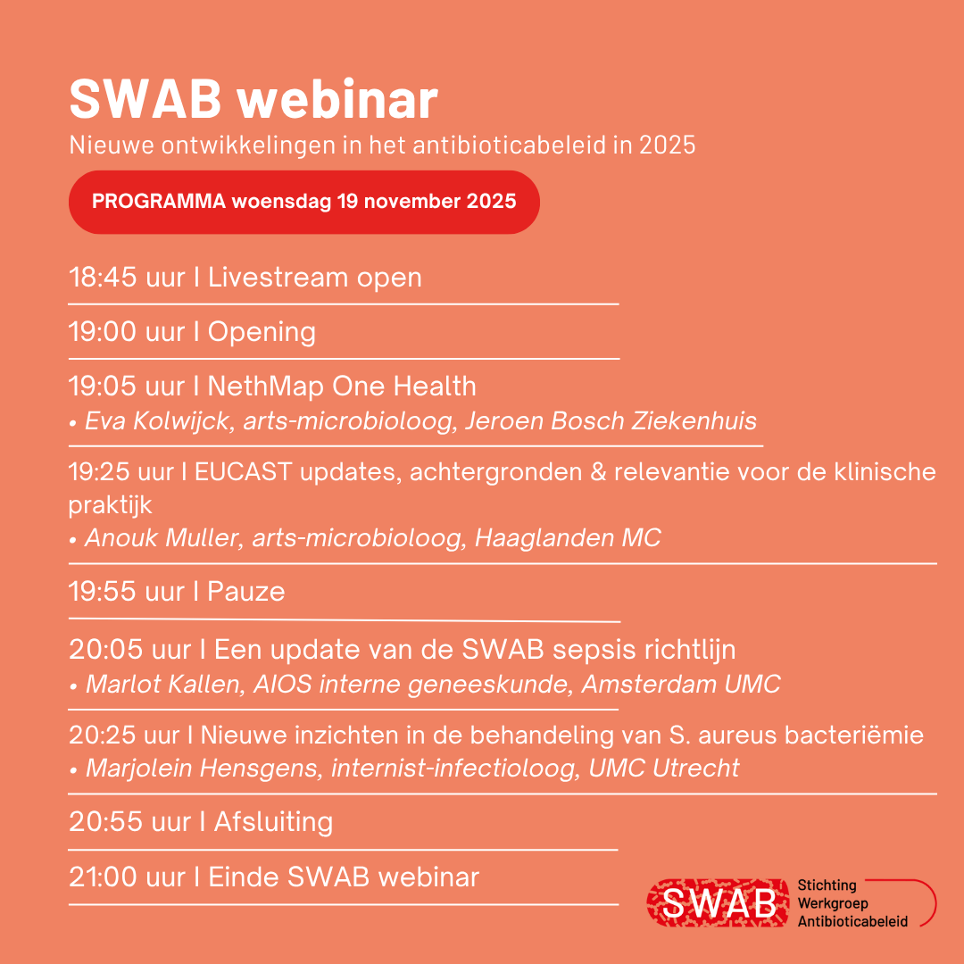 Tijdens de wereldwijde 'AMR Awareness Week’ 2025 organiseert de Stichting Werkgroep Antibioticabeleid (SWAB) op woensdagavond 19 november 2025 vanaf 19:00 uur wederom een breed geaccrediteerd kosteloos online webinar. Het thema is dit jaar: Nieuwe ontwikkelingen in het antibioticabeleid in 2025. In dit kosteloze webinar behandelen we de nieuwste ontwikkelingen in NethMap One Health 2025, gevolgd door EUCAST-updates met hun klinische relevantie. Daarnaast bespreken we de herziening van de SWAB sepsisrichtlijn en delen we nieuwe inzichten in de behandeling van Staphylococcus aureus bacteriëmie.